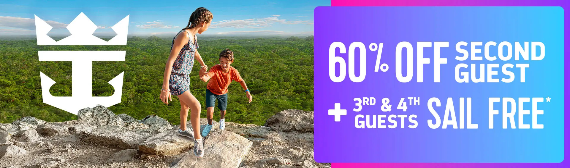 Booking period: April 2 to May 4, 2026. Departure date: Sailings beginning April 3, 2026. Offer details: Third and fourth passengers and above, ages 12 and under (as of the cruise departure date), traveling with two adults and sharing an eligible triple or quadruple occupancy stateroom, travel free on sailings of three nights or more. Offer excludes Thanksgiving sailings (departures between November 19 and November 27, 2026). (Departures between November 18 and November 26, 2027); New Year's Holidays; (Departures between December 17, 2025 and January 4, 2027); (Departures between December 16, 2027 and January 5, 2028); Navigator of the Seas Chinese New Year Departure (Departing February 4-8, 2027); Spring Break Voyages (Departures between March 6 and April 9, 2026); (Departures between March 5 and April 4, 2027); (Departures between March 3 and March 31, 2028); Easter departures (departing between April 7 and April 17, 2028), Alaska departures (departing between May 15 and September 11, 2026); (departing between May 14 and September 17, 2027), summer vacation (departing between May 21 and August 25, 2026) excluding the Harmony of the Seas departure on July 26, 2026; (departing between May 28 and August 20, 2027). *Taxes, fees, and port charges are additional and apply to all passengers.